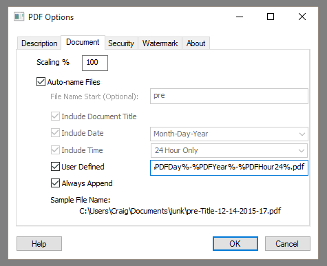 When the "User Defined" option is enabled, the field is filled with the currently selected options in a tag format that is delimited by % characters (e.g. %PDFHour%). Advanced users can re-order the Win2PDF tags to match their requirements, or mix and match tags to create their own file name format. The supported tags are: