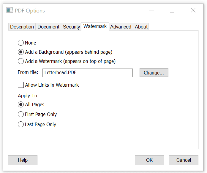If the watermark or background PDF file contains more than one page, only the first page will be applied to each page of the new document. It's best to use a watermark or background PDF file that has the same page size as the newly created PDF file. If the watermark or background file has a different page size, it will be scaled and centered on the page of the newly created PDF file.