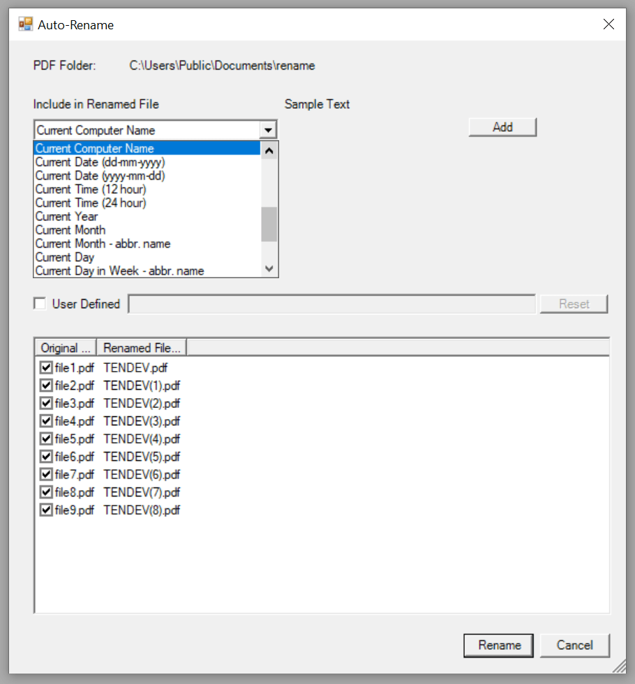 The "User Name" rename option allows you to include the name of the computer in the renamed file name. This is equivalent to the "COMPUTERNAME" environment variable.